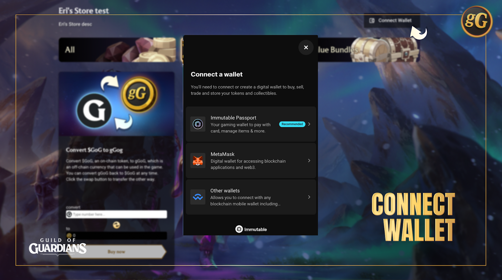 Exclusive to Eri’s Store on web browser, connect your Guild of Guardians account and swap $GOG into gGoG