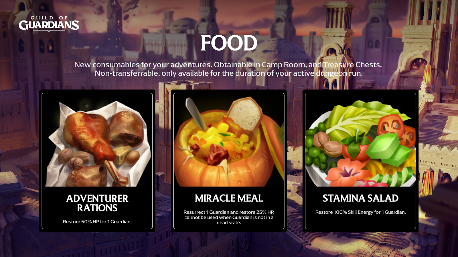 Introducing new consumables inside your Dungeon raids, Food! With 3 new Foods items being introduced, players can collect and consume Foods throughout the event, with each type of food carrying it’s own benefits and effects. Food can be obtained through Treasure Chests, as well as in Camp Rooms.