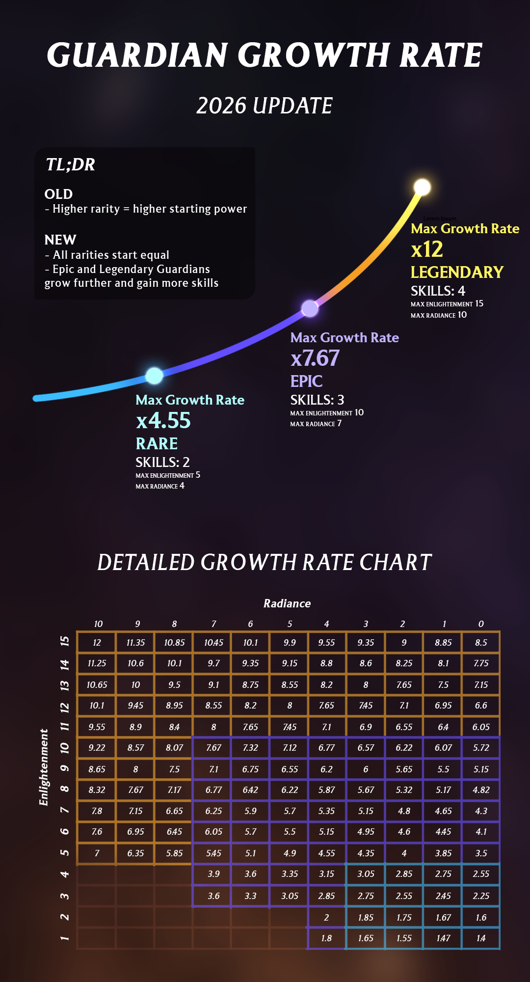 Previously, Guardians of different rarities started with different growth values. With this update, Rare, Epic, and Legendary Guardians now share the same base growth curve, creating a more consistent progression foundation across the roster.